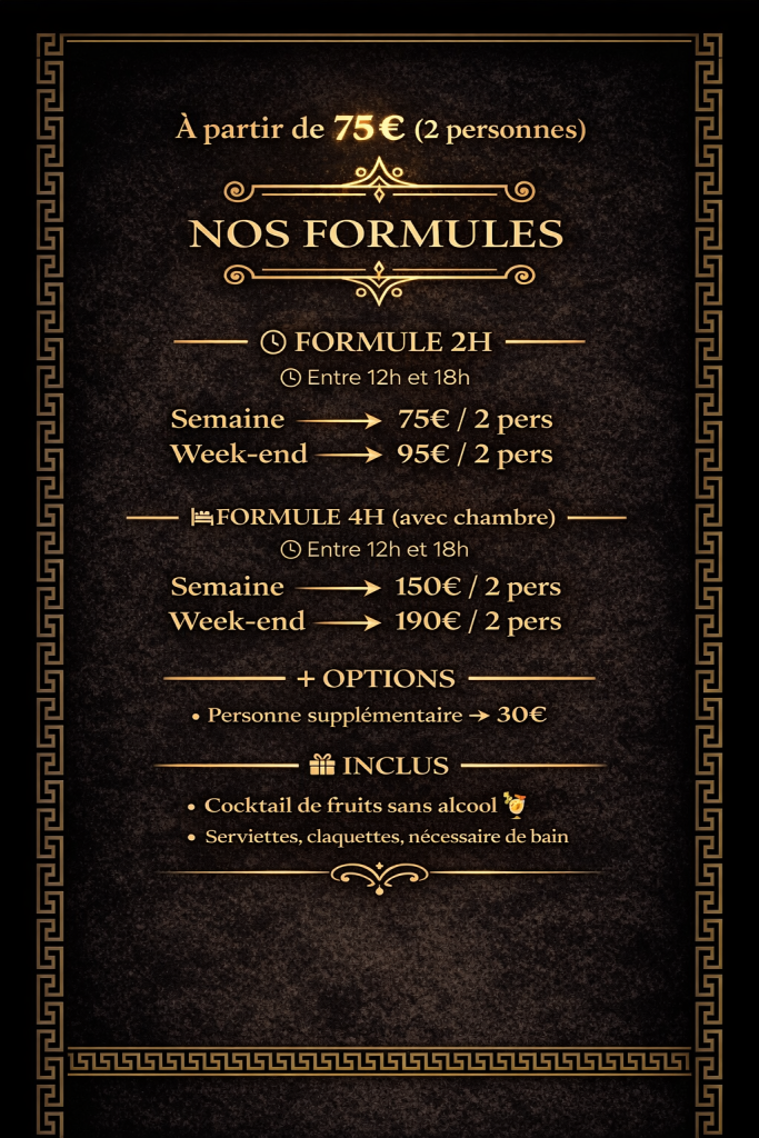 Découvrez nos tarifs pour un spa privatif avec jacuzzi à Wattrelos, proche de Lille, Roubaix et Tourcoing.